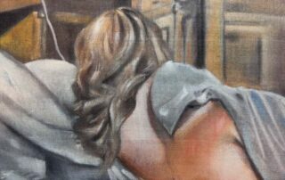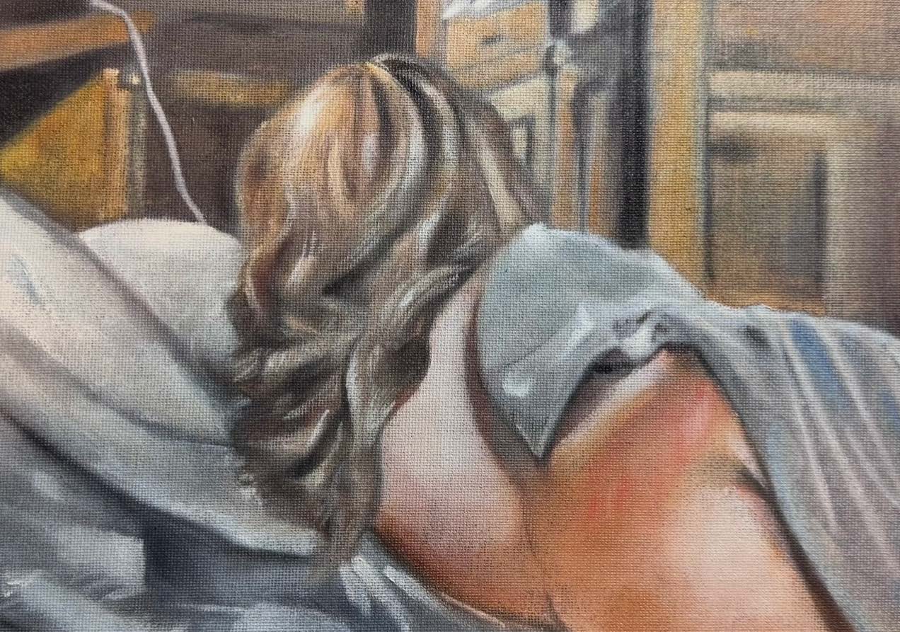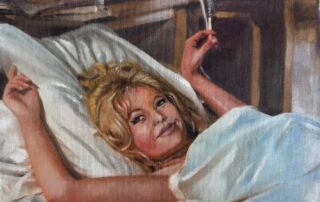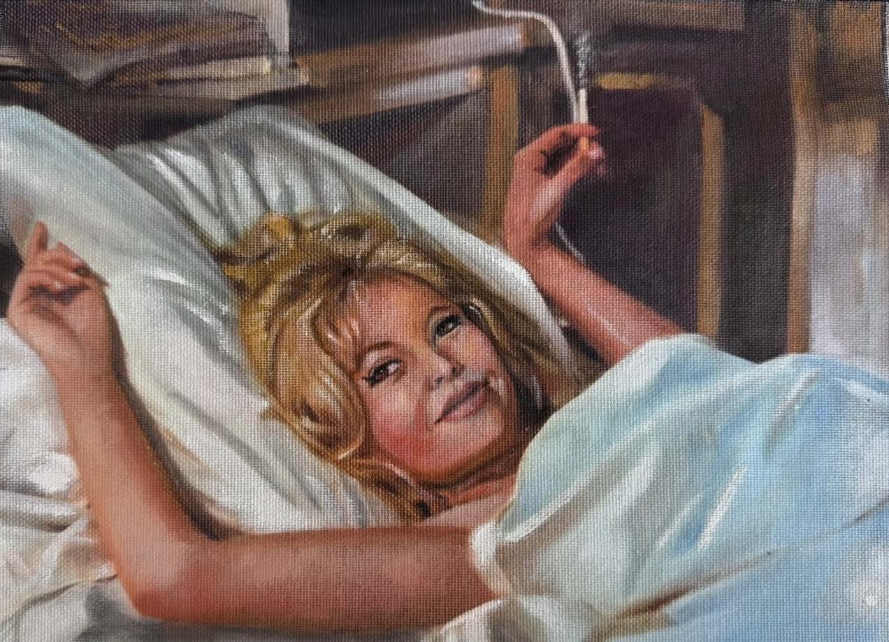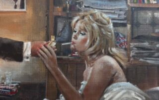 Our five segments in oil run like a scene from one of her classic French features from the fifties. Having spent the night with a gentleman, the lady is in need of replenishment and nicotine.